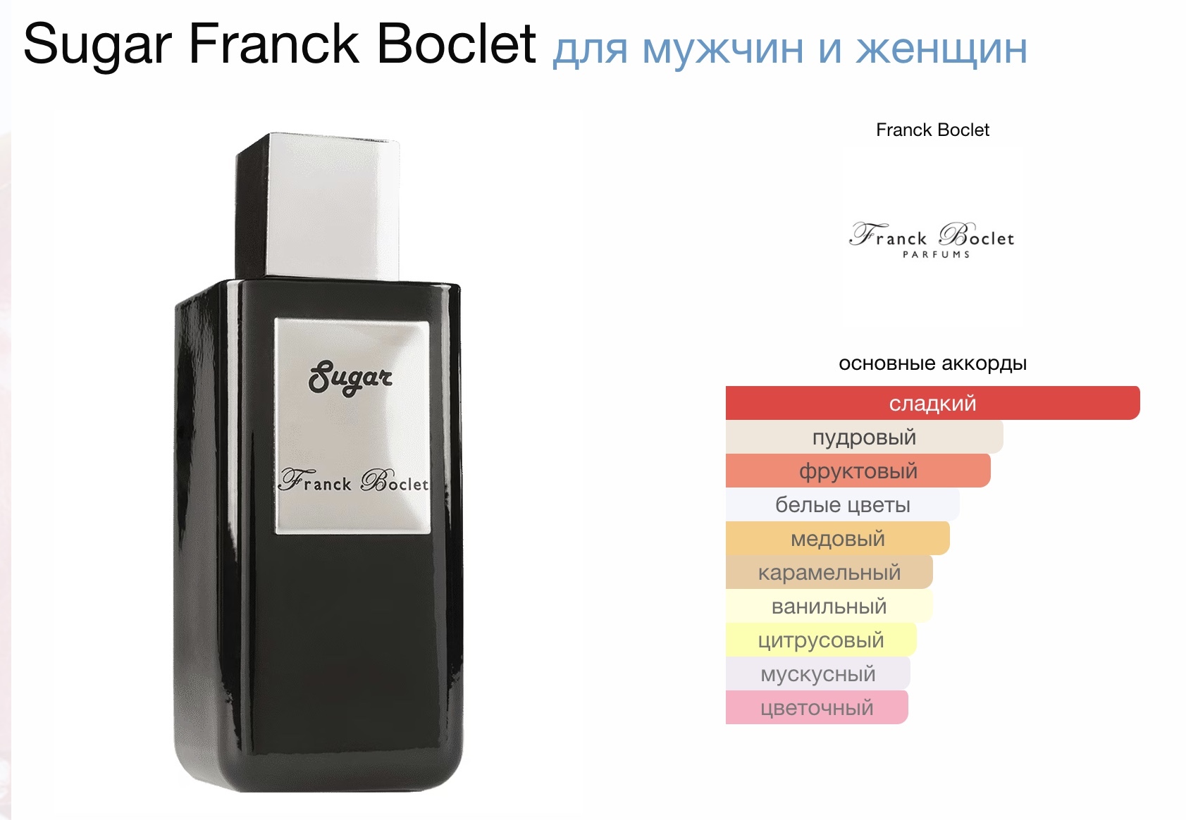 Sugar Franck Boclet — это аромат для мужчин и женщин, он принадлежит к группе цветочные фруктовые сладкие.