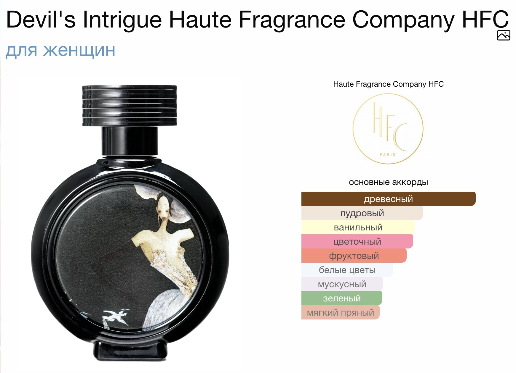 Devil's Intrigue Haute Fragrance Company HFC — это аромат для женщин, он принадлежит к группе цветочные древесно-мускусные.