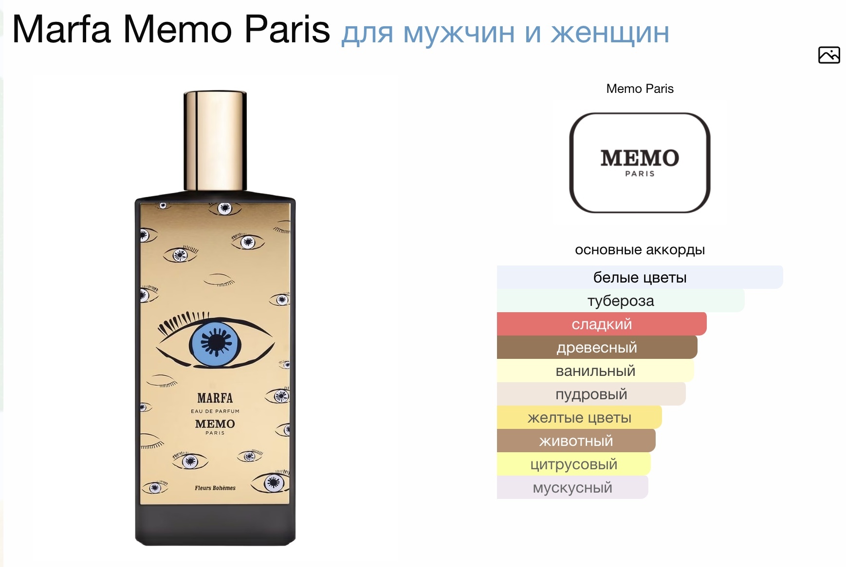 Marfa Memo Paris — это аромат для мужчин и женщин, он принадлежит к группе цветочные древесно-мускусные.